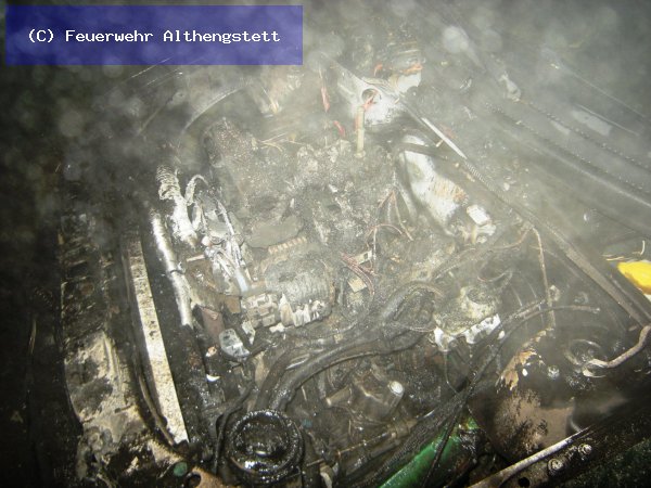 Die Feuerwehr öffnete die Motorhaube mit Hilfe eines Brecheisens und löschte anschließend den Motorraum über einen Schnellangriff.