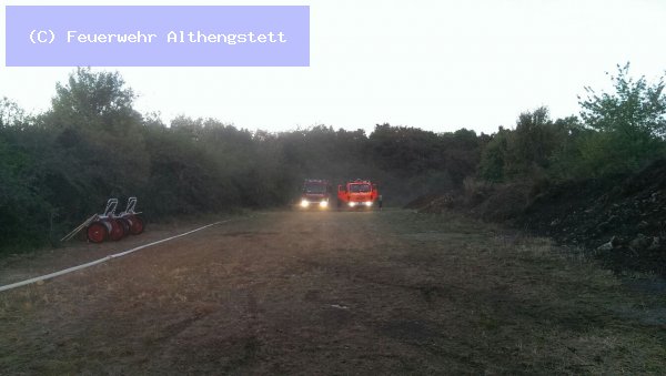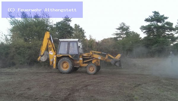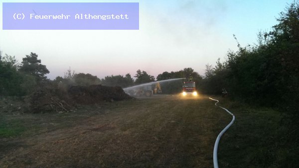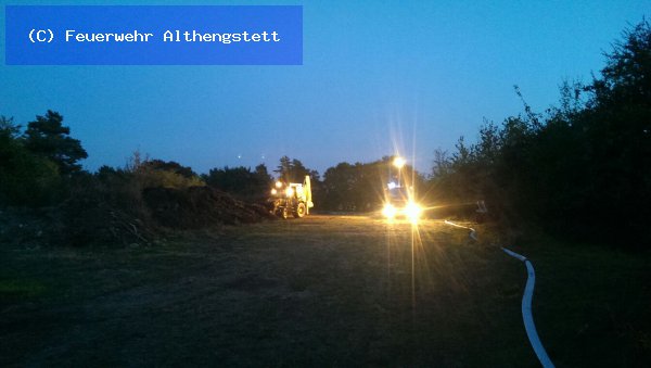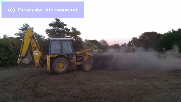 Mit einem Radlader der Fa. Schwarz - Althengstett - wurde der Haufen abgetragen und mit 2 C-Rohren und dem Wenderohr abgelöscht. Wasserversorgung - Pendelverkehr - TLF 24/50 Calw und als Verstärkung - LF 20 der FW Althengstett. Nach dem Ablöschen wurde die Einsatzstelle an die Wache der Kaserne übergeben.